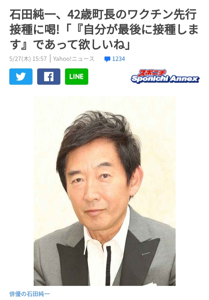 俳優の石田純一(67)が25日に自身のYouTubeチャンネルを更新。新型コロナウィルスのワクチン接種について、自身の意見を語る場面があった。 茨城県城里町の上遠野修町長(42)が、医療従事者に優先的に届けられたワクチンを接種していたことについても言及。「42歳の町長がね、医療従事者の1人して優先的に接種を受けたと。問題ありますよね。全ての自治体のトップの人が、まず優先的になんて日本的じゃない。美しくないですよね」とズバリ指摘。![]()